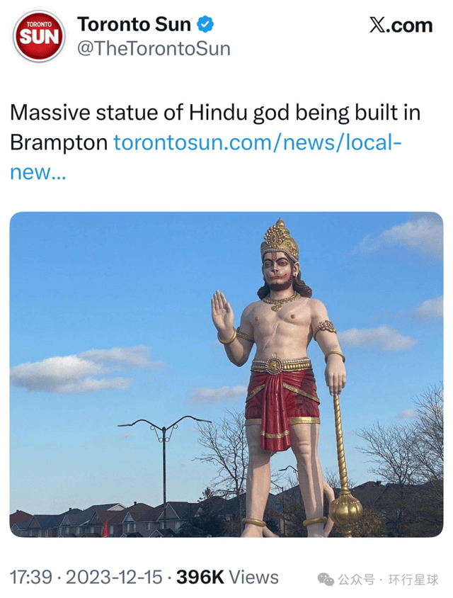 在多伦多皮尔逊国际机场附近的布兰普顿(Brampton),一座高达16米的“哈奴曼”神像在2023年落成。