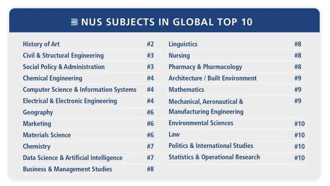NUS的综合科研实力很强,优势学科有工商管理、信息与新媒体、计算机科学、机械电子学、艺术设计类。以QS学科排名为例,NUS在41个参评学科中均表现亮眼,其中22个学科跻身全球前十,例如: