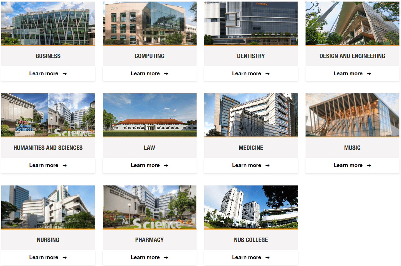 NUS有16个学院50多个专业,本科由文学暨社会科学院、商学院、牙科学院、设计与工程学院、法学院、理学院等12个学院组成,大家可以在官网查询感兴趣的专业信息 ↓↓↓